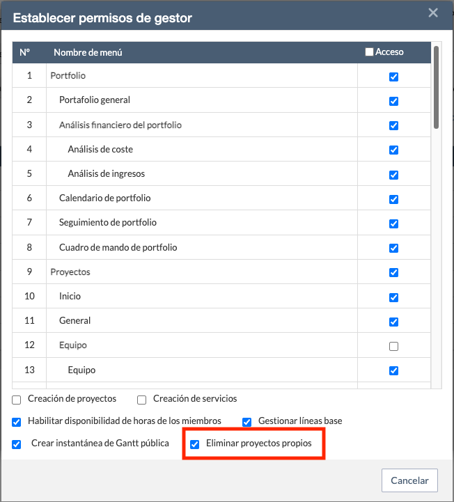 Si desea desactivar este permiso para Project Managers o usuarios con roles personalizados, vaya a Organización → Gestión de usuarios → Definición de roles, seleccione el rol correspondiente, haga clic en Establecer permisos de gestor y desmarque la opción 'Eliminar proyectos propios'.