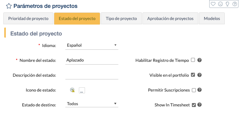 Importante: Si un estado tiene activada la opción "Habilitar registro de tiempo", debe ser visible en el parte de horas. En este caso, la casilla "Mostrar en parte de horas" se marcará automáticamente y quedará deshabilitada.