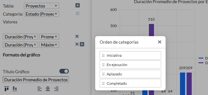 También puede cambiar el orden en que se muestran las categorías en un gráfico. Una vez configurados la tabla, la categoría y al menos un valor, aparecerá un icono junto al selector de categoría. Haga clic en él para abrir una ventana emergente donde podrá reordenar las categorías arrastrándolas y soltándolas. Una vez guardado, el orden personalizado se mantendrá. Si está en modo Edición y guarda el cuadro de mando, el orden de las categorías quedará configurado para todos los usuarios.