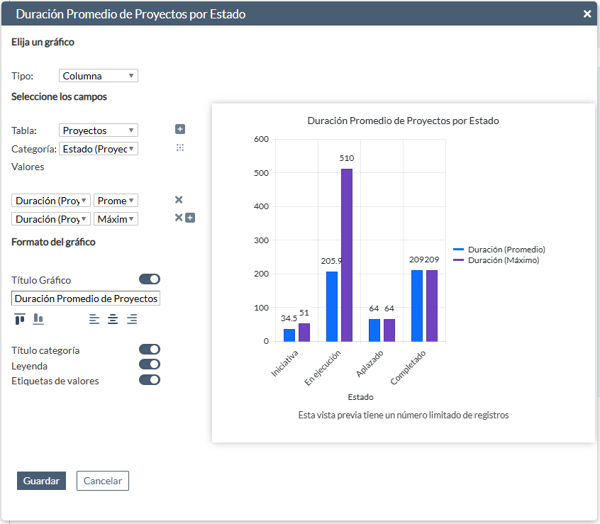 Para añadir un nuevo gráfico, puede elegir un tipo de gráfico, como de columnas, de barras, de líneas, de áreas o de pastel, y seleccionar una tabla, por ejemplo, “projects.” Luego, elija una categoría, como “Objetivos,” y añada una tabla secundaria si es necesario. A continuación, seleccione un valor, como “total actual cost,” y elija una operación para aplicar a ese valor, como contar, sumar, promediar, máximo, mínimo o el primer valor.
