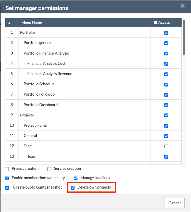 If you want to disable this permission for Project Managers or users with custom roles, go to Organization → User management → Role definition, select the corresponding role, click Set manager permissions, and unmark the 'Delete own projects' option.