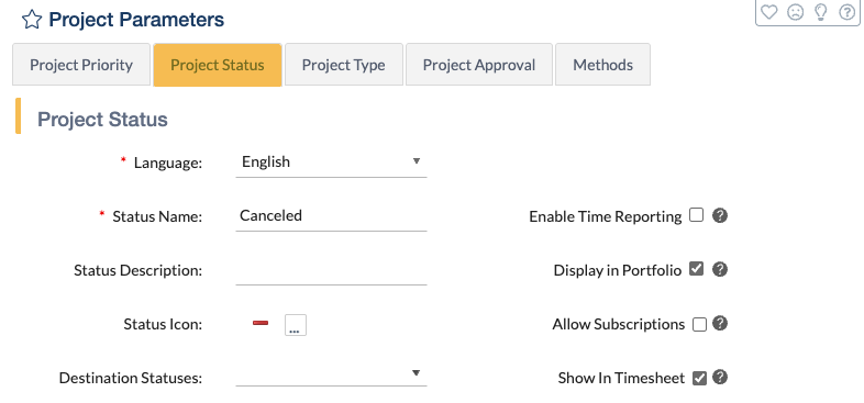 When defining a project status, you can also control if projects with that status appear in users' timesheets. This is useful for hiding projects that don't require time tracking (like internal or "Scrum" projects) to keep timesheets clean.