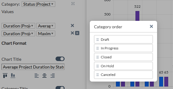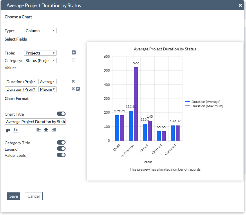 To add a new chart, you can choose a chart type, such as column, bar, line, area, or pie, and select a table, such as “projects.” Then, choose a category, such as “business goal,” and add a secondary table if needed. Next, select a value, such as “total actual cost,” and choose an operation to perform on that value, such as count, sum, average, maximum, minimum, or the first value.
